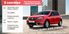 6 сентября приглашаем всех поклонников марки Renault в наш автосалон! В этот день Вы станете первыми, кто сможет увидеть, пройти тест-драйв и стать владельцем Нового Рено Сандеро!