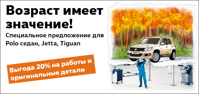 *Период проведения акции с 1 сентября по 31 декабря 2015 г. Предложение действует для Volkswagen Polo седан, Jetta и Tiguan 2008 – 2013 г.в. Выгода распространяется на определенный перечень работ сервиса и оригинальные детали, участвующие в акции. Гарантия на оригинальные детали 2 года.